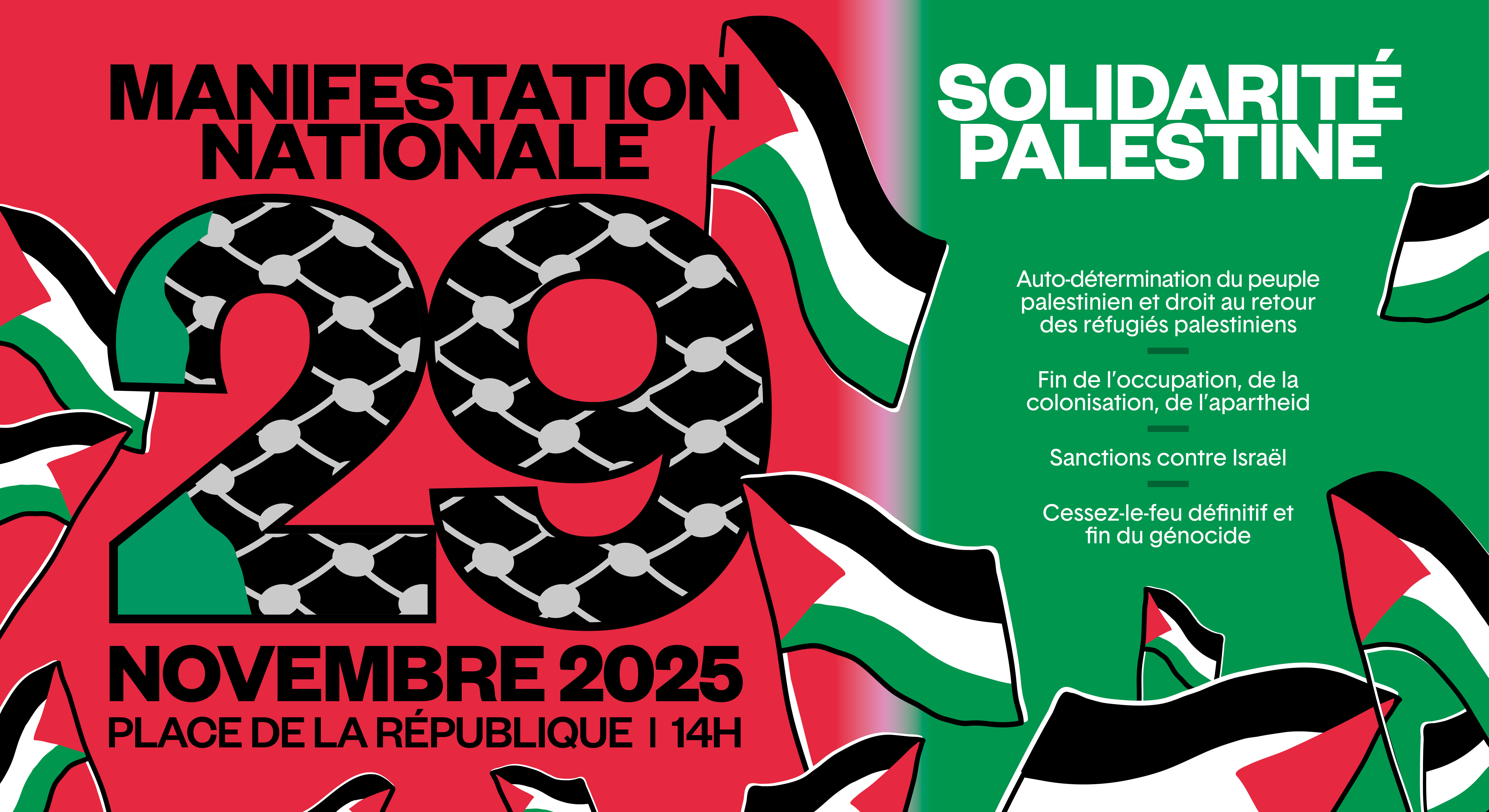 Samedi 29 novembre à 14h à Paris: Manifestation Nationale Après l’accord du cessez-le-feu à Gaza, Israël poursuit l’occupation et la colonisation de la Palestine, l’oppression du peuple palestinien. Cela doit cesser ! Nous manifesterons, avec l’ensemble des signataires, le 29 novembre pour la défense des droits du peuple palestinien sur la base du droit international – Place de la République – Paris >> |