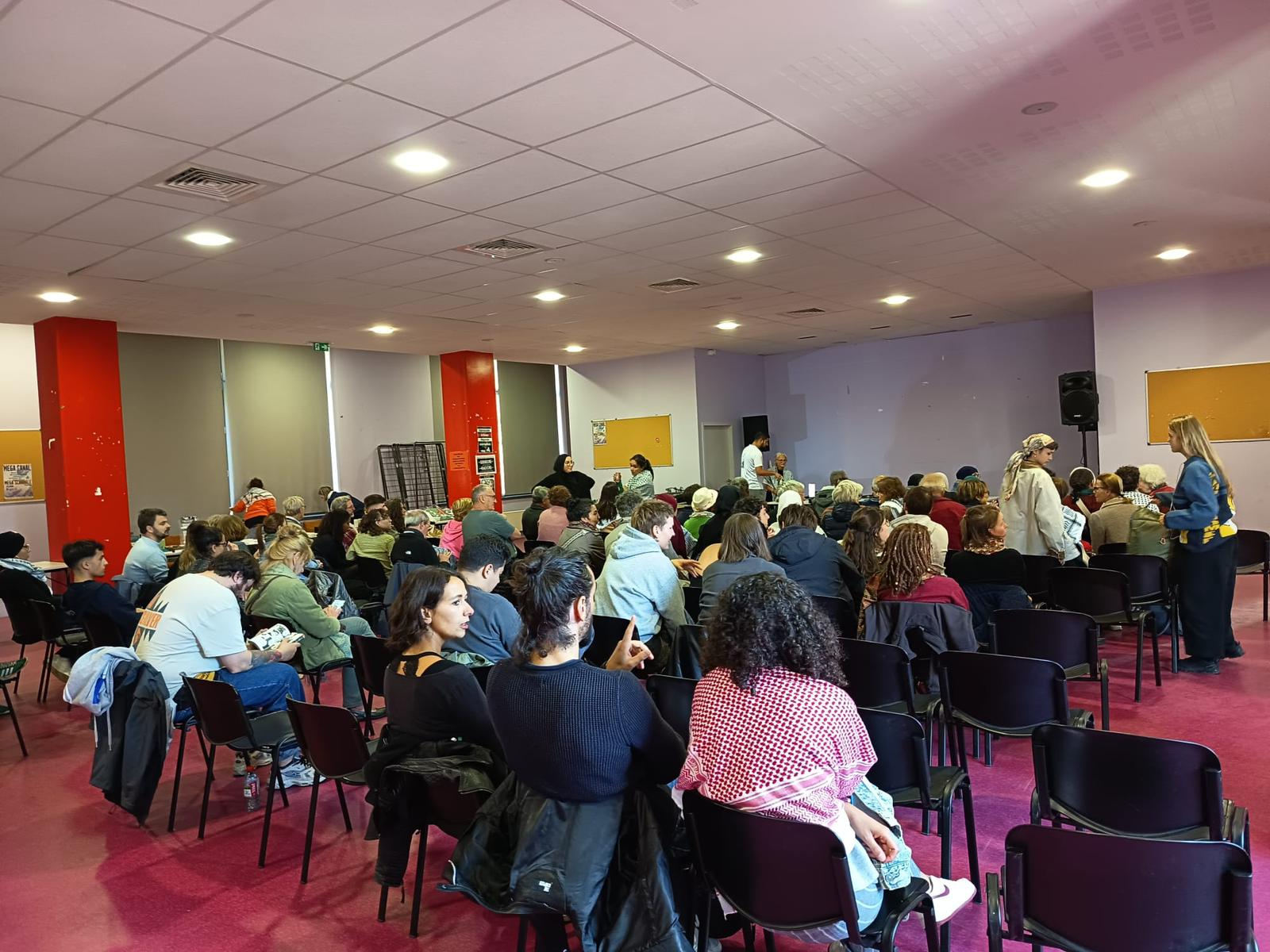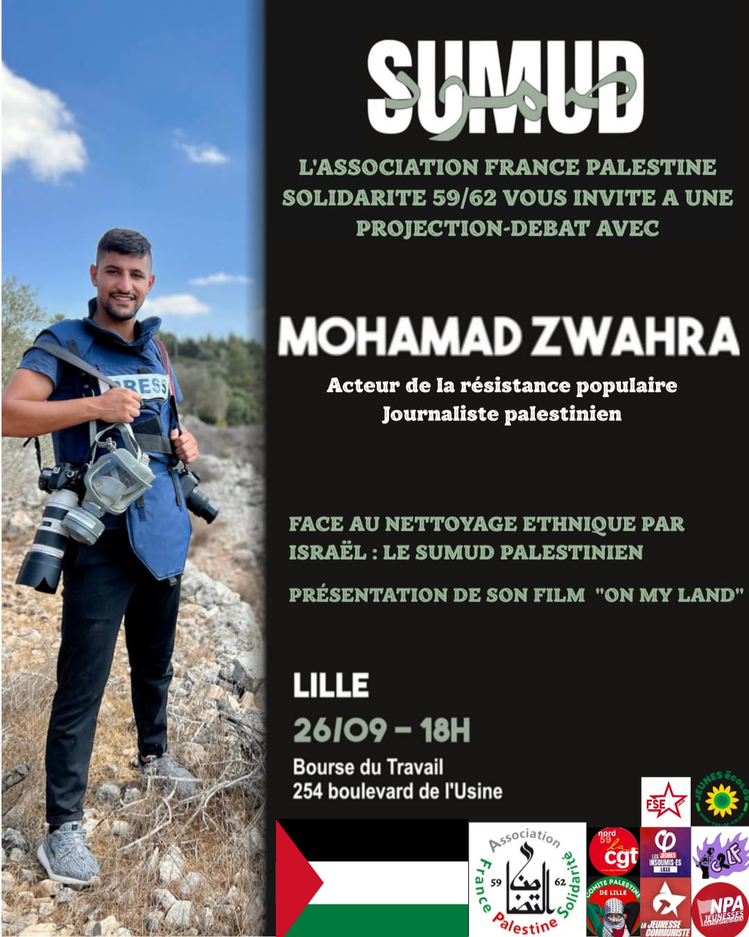 Ce vendredi 26 septembre 2025 à la Bourse du travail de Lille , nous avons accueilli Mohamed Zwahra, journaliste et résistant palestinien, auteur d’un documentaire « On my Land » (Sur ma Terre) dans le cadre d’une tournée organisée par l’AFPS, soutenue par de nombreuses organisations de jeunesse. Il y montre le quotidien de l’occupation et de la violence coloniale du village d’Al Masara, près de Bethléem. Cette tentative d’expropriation par des colons de leur terre est omniprésente, mais la résistance palestinienne (symbolisée par le Sumud) ne s’éteint jamais. Chaque jour elle se manifeste à travers l’importance de la scolarisation des enfants, de la place de la culture de la terre, des traditions transmises aux générations futures, des manifestations hebdomadaires contre l’occupation et de la volonté inébranlable des Palestiniens à rester sur leur terre. Lors d’un échange avec le public, Mohamed a témoigné de l’importance de cette lutte dans une Cisjordanie morcelée par l’implantation grandissante de colonies sur les terres palestiniennes, et de l’importance de continuer à lutter ailleurs qu’en Palestine. Nous le remercions pour cet espoir qu’il a transmis au public, nous continuerons de soutenir et de lutter auprès du peuple palestinien jusqu’à la libération.