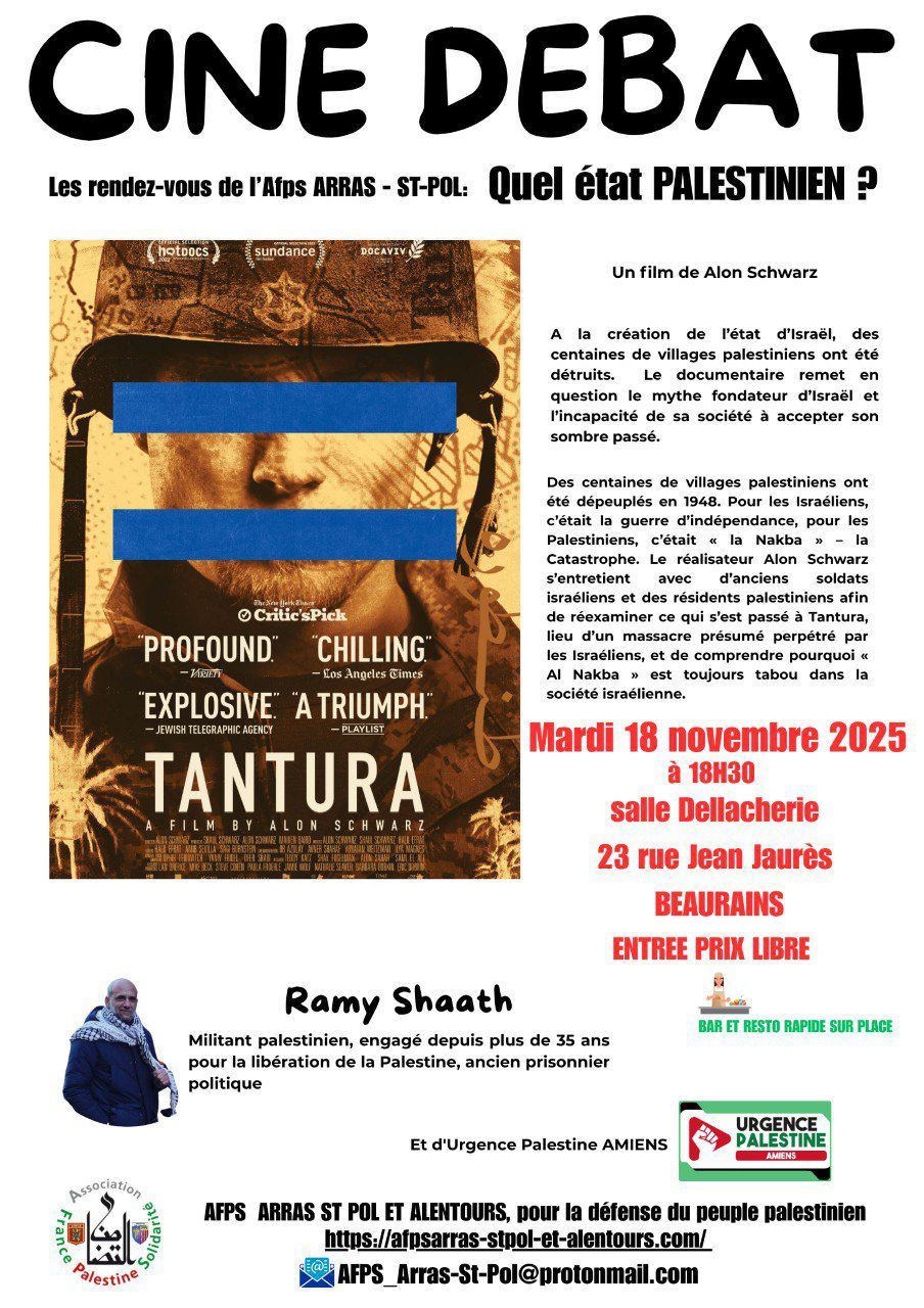 Mardi 18 novembre à 18h30 à Beaurains: Ciné – Débat Autour du film « Tantura » avec la participation du militant palestinien Ramy Shaath – Salle Dellacherie – 23 rue Jean Jaurès - Beaurins >> |