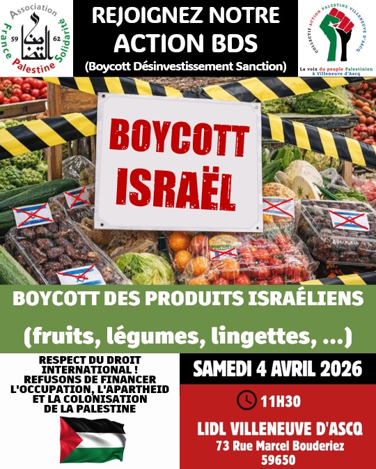 Samedi 04 avril à 11h30 à Villeneuve d’Ascq: Action BDS Boycott des produits israéliens – 73 Rue Marcel Bouderiez – Lild Villeneuve d’Ascq >> |