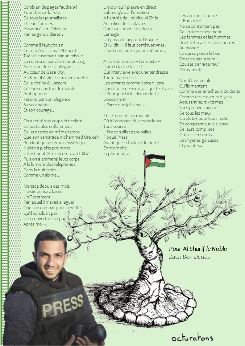 de la banderole installée le soir même de l'assassinat d'Anas Sharif et