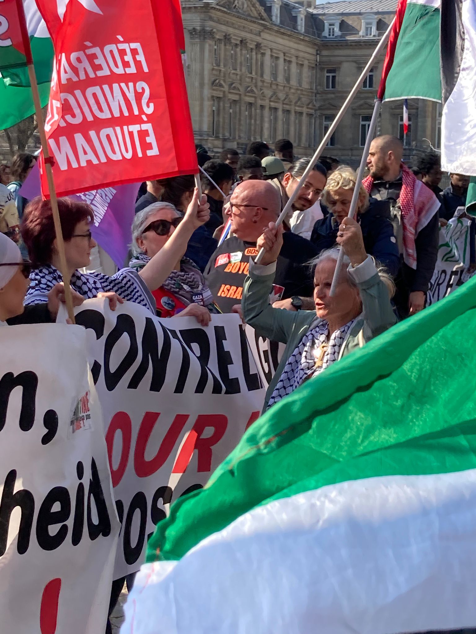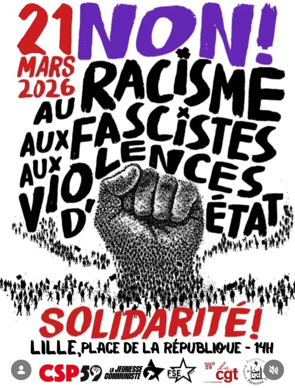Samedi 21 mars, dans le cadre de la journée internationale de lutte contre le racisme, près d'un millier de manifestants ont défilé du centre ville de Lille jusqu'au local du Comité des Sans papiers 59, dans le quartier populaire de Fives. L'AFPS 59/62 a participé à cette mobilisation et rappelé que notre association est fondamentalement antiraciste et antifasciste, et que notre solidarité avec le peuple palestinien doit être inconditionnelle face à l'État colonial génocidaire israélien et à ses alliés étasunien et européen.